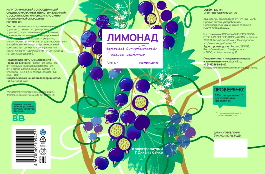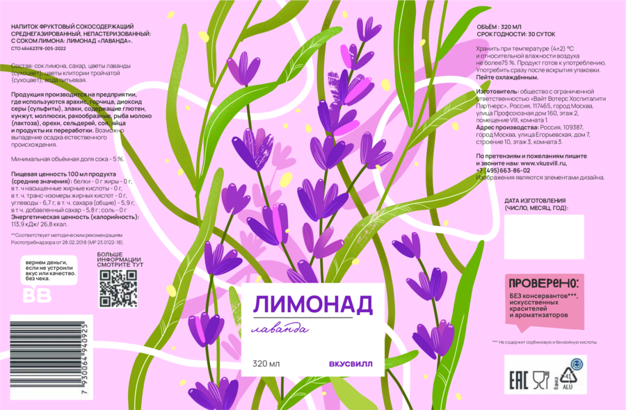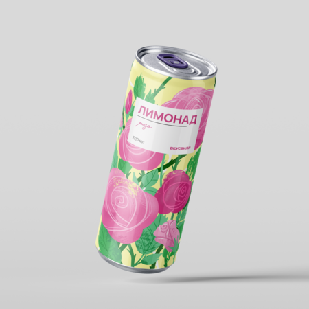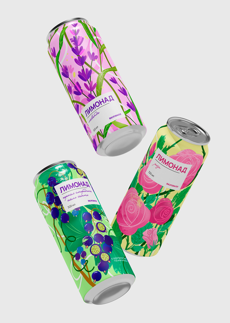 Иллюстрации и дизайн к натуральным лимонадам ВкусВилл с нестандартными нишевыми вкусами: «Роза», «Лаванда», «Чёрная смородина —