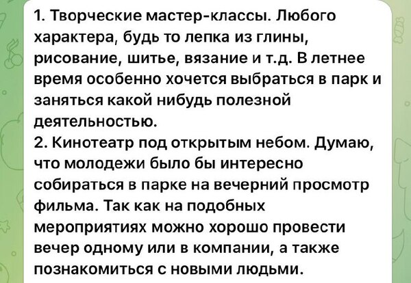 В опросе, помимо творческих мастер-классов, предложили ещё и спортивные мероприятия. Плюс для старшего поколения, особенно с сидящим образом жизни, это должно быть подходящей рекламой.