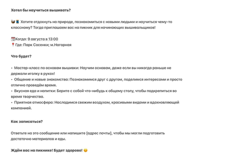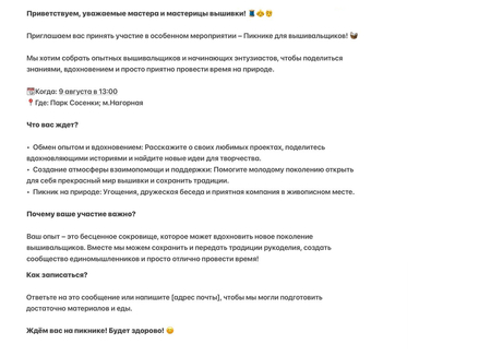 Из мероприятий в районе есть только базовые мастер-классы от местных библиотек ко всяким праздникам. Думаю, на фоне этого мой пикник будет выделяться.