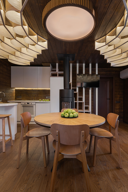 Для вдохновения я использовала традиционные купола в юртах Хакасии По центру купола обычно небо — в проекте светильник. Здесь намёк на соединение двух различных культурных контекстов которые свойственны мне как автору. Воспоминания детства проведённого на старой даче под абажуром и степи Сибири откуда ведёт своё начало мой род. Остальные дизайн решения подчинены выявлению главного акцента. Для этого оставляется традиционная отделка -обшивка деревом. Основное колористическое решение — это тёплые оттенки хлеба и молока.