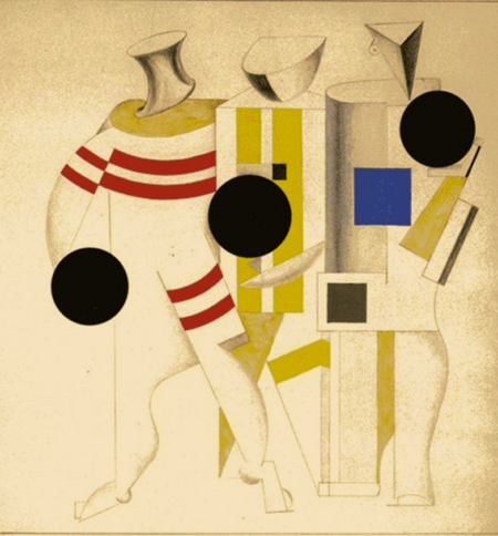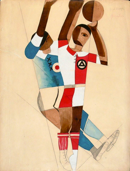 Слева — «Супрематический сказ про два квадрата» (1922), Справа — эскиз костюмов воллейболистов к опере Виктора Оранского «Футболист», Анатолий Петрицкий. (1929)