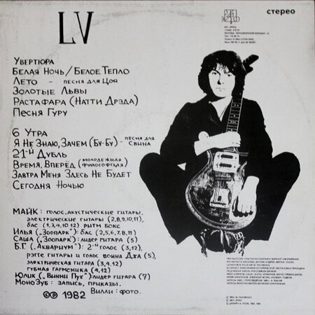 При обработке фотографии Майка Науменко Усов использовал скальпель, убирая фон и оставляя только фигуру музыканта. В результате возник тот визуальный эффект, который сегодня часто выделяют исследователи и коллекционеры: Майк будто зависает в воздухе. Его силуэт отрывается от земли, напоминая не портрет, а графическую эмблему. Именно это ощущение стало источником интерпретации, что название «LV» можно читать как «левитацию» — хотя сам Науменко вкладывал в него более буквальное значение («Ленинградский вокзал»), образ невесомости добавил альбому новое смысловое измерение.