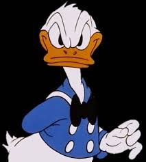 Дональд с надутым лицом и сжатыми кулаками. Классическое изображение гнева Дональда Дака.