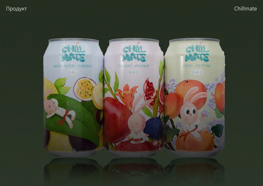 The mascot hare must actively interact with cans: hold one can, sit on another, wave his paw or check the packaging.