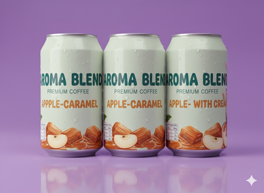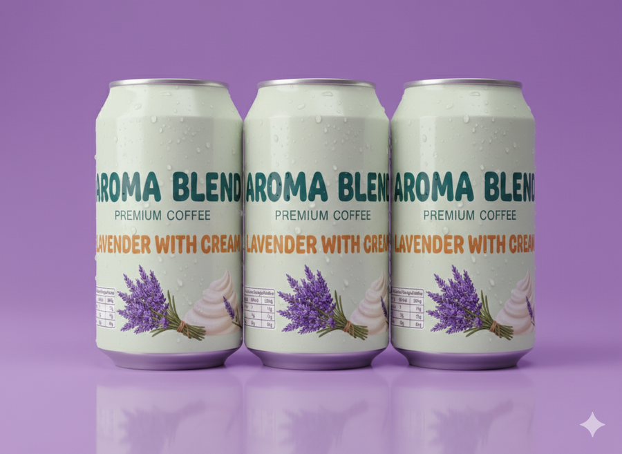 Promt: Create a realistic composition from cans of coffee with different flavors, based on the style, color palette and design of previous generations, using the provided references, but create a new original composition without copying them completely.