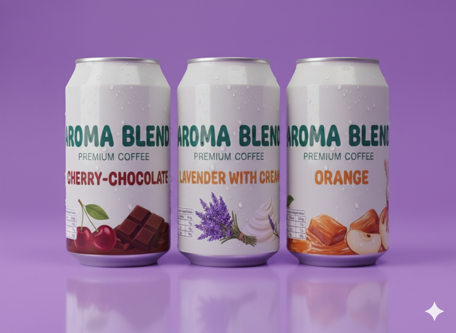 There are several cans of coffee with different flavors on the line.: «Cherry–Chocolate», «Lavender with cream», «Orange» (and others if necessary).