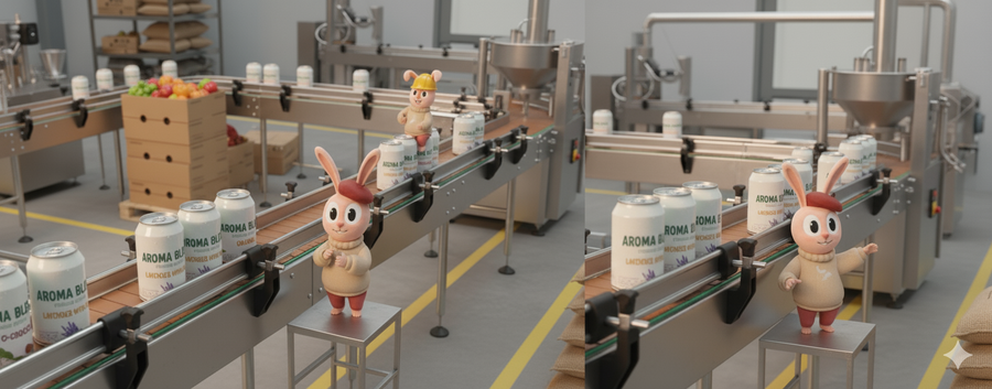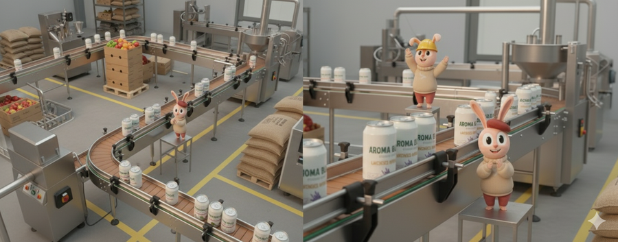 Promt: Create a realistic scene inside a coffee factory, with a packaging line featuring a mascot bunny, showcasing the brand’s entire range of flavors.