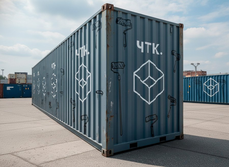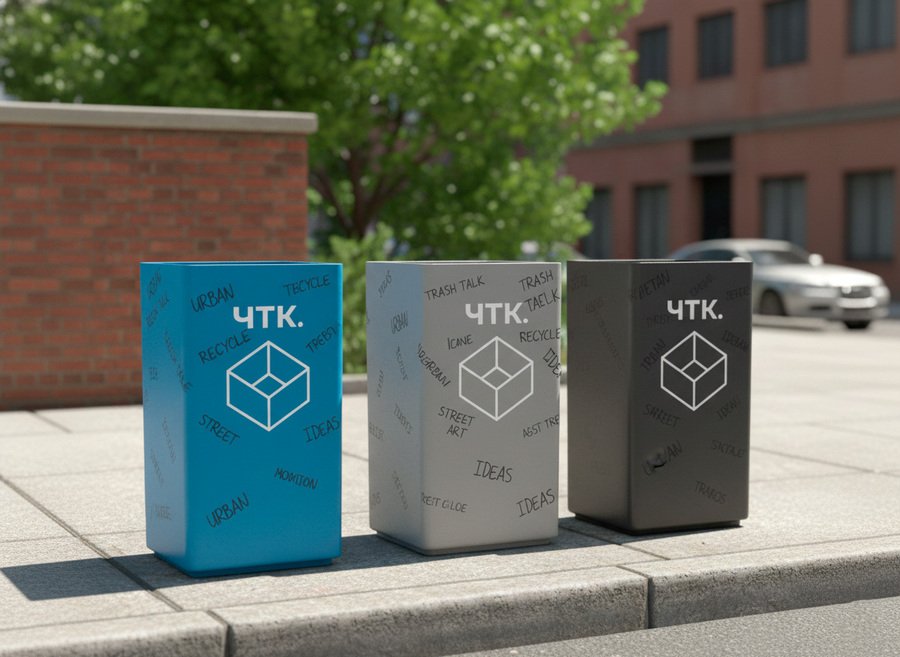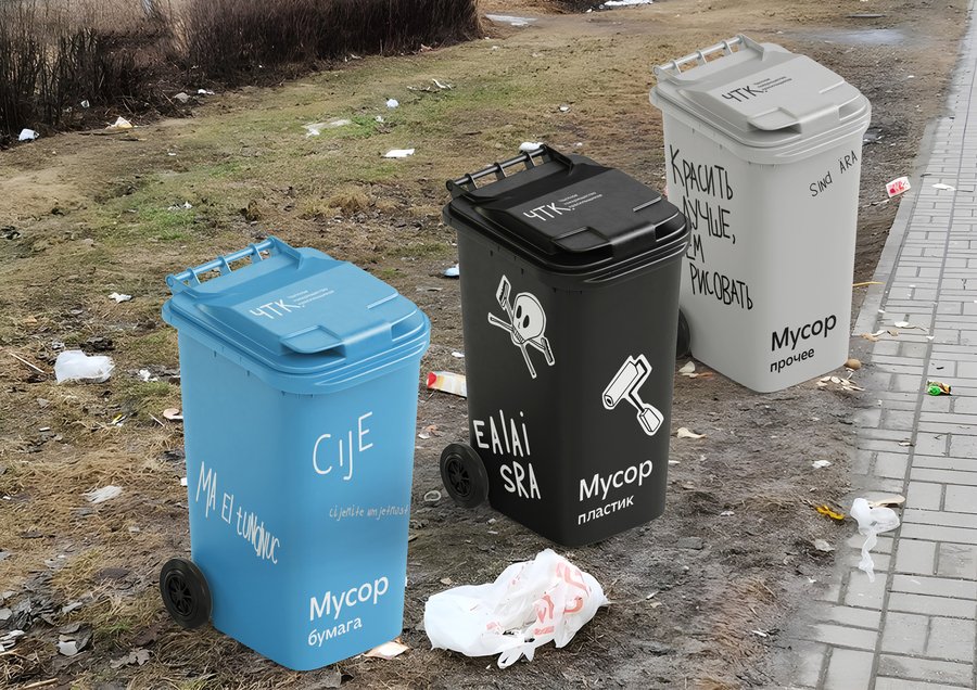 Мусорные баки и блок контейнер сгенерированы в нейросети Google AI Studio. Промт баков: Сделай мокап трех мусорных баков на улице с логотипом который я прислала выше. Один бак ярко синий, второй светло серый, третий темно серый. На них написаны случайные английские слова тонким черным маркером. Промт контейнера: Сделай мокап серого блок контейнера с логотипом который я прислала. На контейнере должны быть изображения валиков с краской тонким черным контуром.