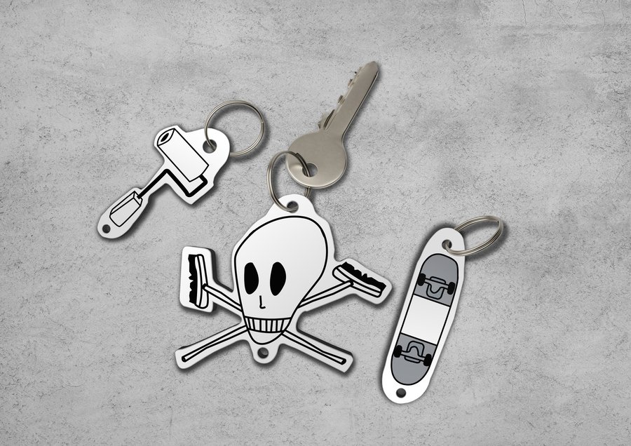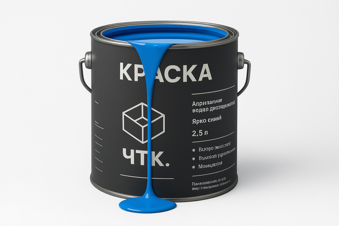 Коробки, брелки, банка краски и скотч сгенерированы в нейросети ChatGPT [3]. Промт коробок: Создай мокап с картонными коробками на сером фоне используя этот логотип. Добавь некоторые элементы фирменного стиля и сделай картинку горизонтальную А4. Промт скотча: Сделай мокап прозрачного скотча с рисунком этого логотипа и добавь похожие элементы фирменного стиля как на картинке выше. Промт банки с краской: Сделай мокап банки с краской с рисунком этого логотипа. Добавь элементы фирменного стиля. Из банки должна вытекать ярко синяя краска. Сделай на банке этикетку и напиши там разную информацию которую обычно пишут на банках с краской. Банка на светло сером фоне. Промт брелков: Сделай мокап трех брелков для ключей. Один ярко синий, второй светло серый, третий темно серый. На брелках изображены валики для краски. Брелки на светло сером фоне.