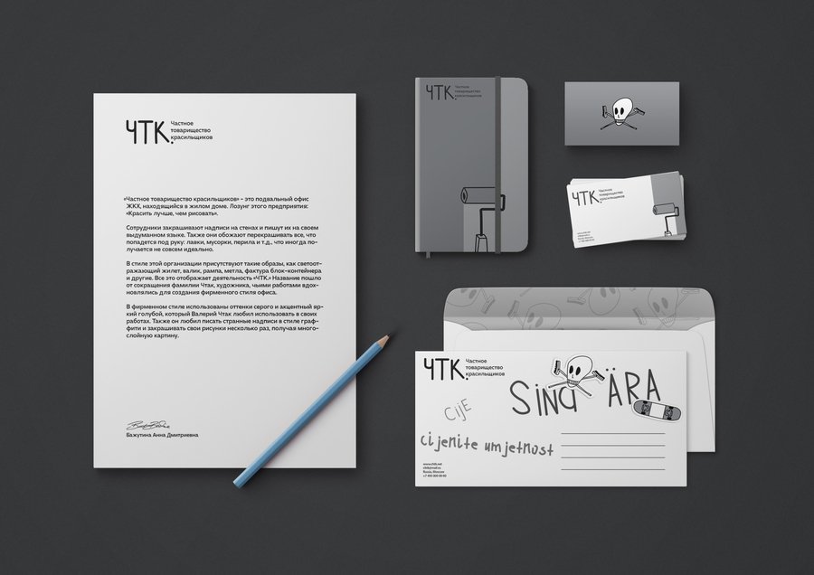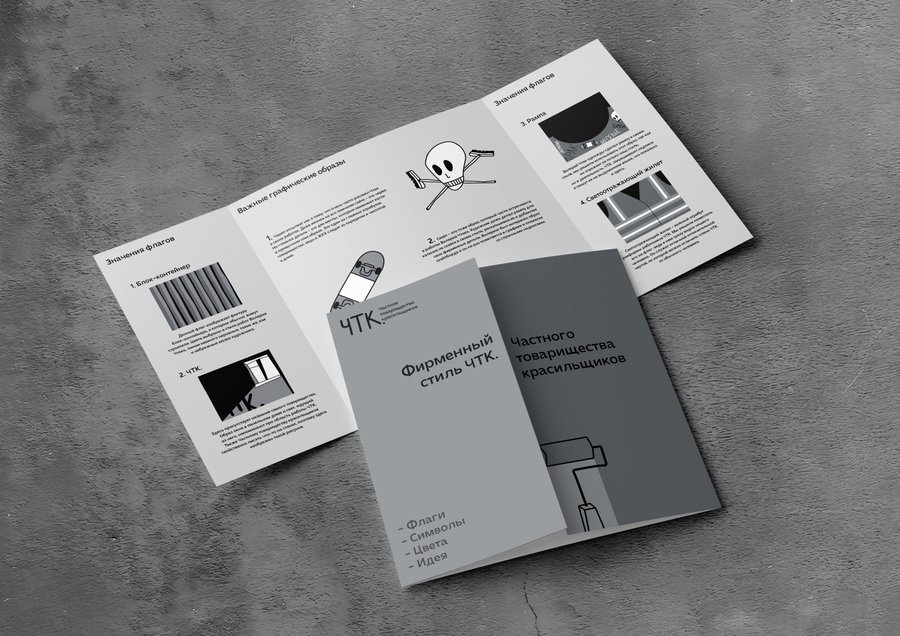 Данный проект представляет собой идею стартапа для подвального офиса ЖКХ «Частное товарищество красильщиков.» или «ЧТК.». Создан фирменный стиль офиса, промо-материалы и организация пространства.