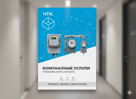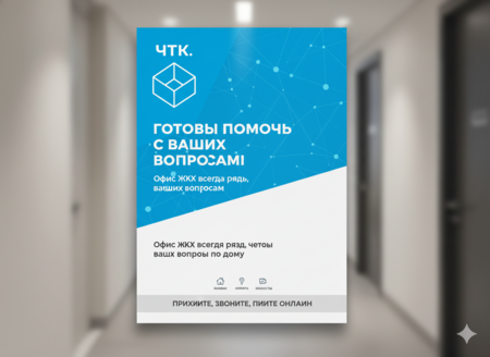 Изображения сгенерированы в нейросети Google AI Studio. Промт: 1. Сделай вертикальный постер А4 подвального офиса ЖКХ под названием ЧТК. который информирует о том, что ЖКХ готово помочь жителям дома с их вопросами. Цветовая гамма: ярко синий, светло серый, темно серый. Добавь на постер элементы фирменного стиля. 2. Сделай еще один новый постер, не похожий на предыдущие. Добавь реализма. 3. Сделай еще один новый постер в таком же стиле. Пусть на постере будет информация, что офис ЖКХ готов помочь жителям дома с их вопросами. 4. Сделай еще один новый постер в таком же стиле, добавь реализма и другую тему.
