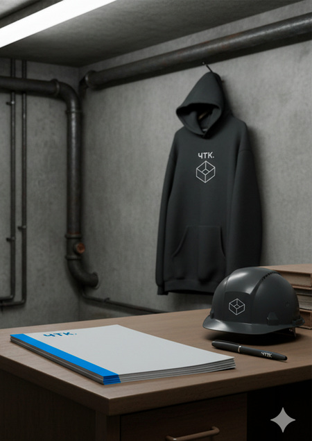 Для генерации мокапа канцелярии была использована нейросеть Google AI Studio [4]. Промт: Сделай мокап Типографики и носителей в фирменном стиле подвального офиса ЖКХ под названием ЧТК. Логотип прикреплен к сообщению. Фирменные цвета светло серый, темно серый и немного ярко синего.