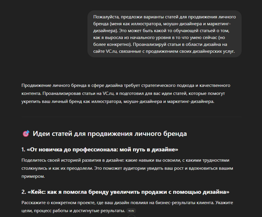 С помощью ChatGPT быстро получен список тем для статьи, найдены ключевые слова для SEO-оптимизации статьи, полностью написана вся статья (с помощью функции «Deep Research» — я попросила нейросеть проанализировать другие статьи в моей тематике именно на сайте vc.ru и написать что-то похожее).