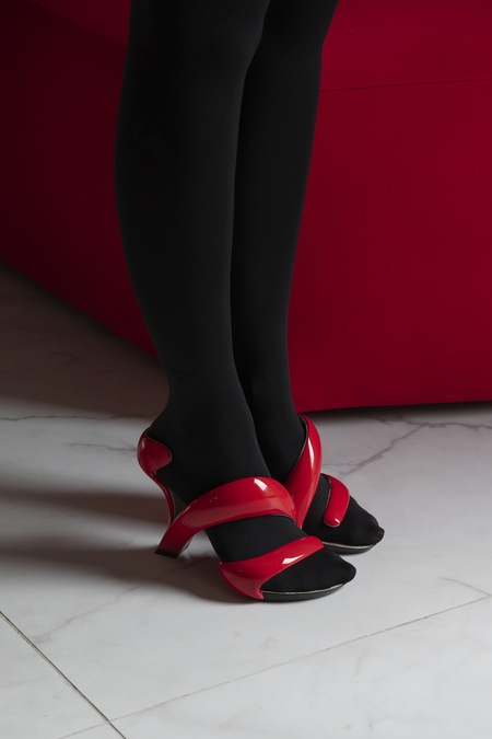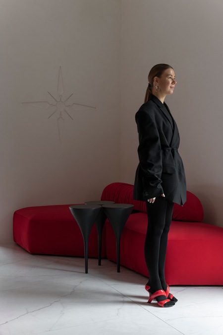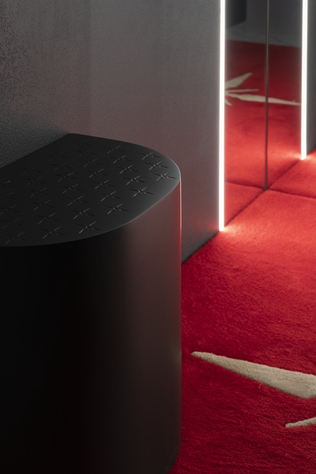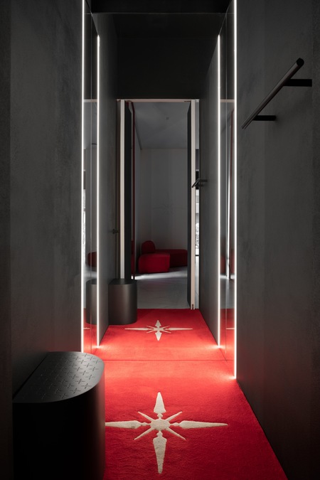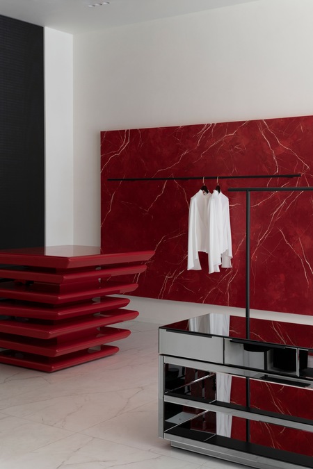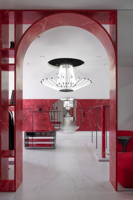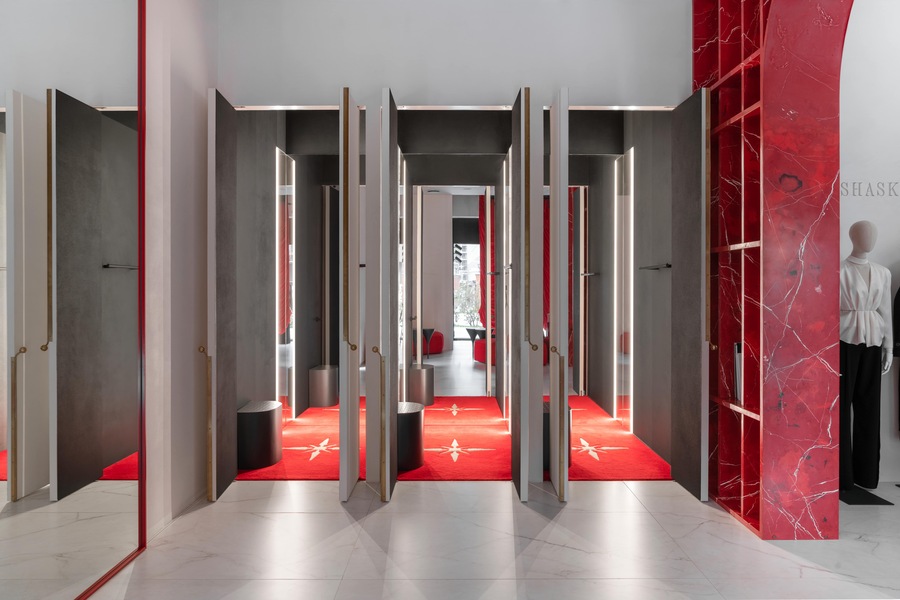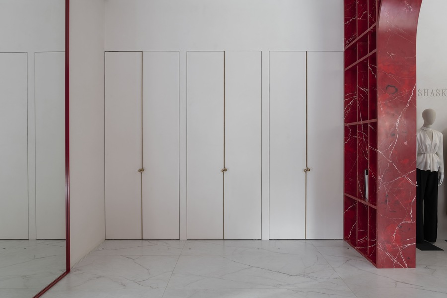 In the process of developing the brand’s concept, we employed the corporate colours as our foundation, actively engaging with the brand identity guidelines, which were concurrently created alongside the interior design. The primary colour is red, with the addition of a warm shade of white to imbue a sense of airiness. The dressing room and bathroom spaces were given a more intimate feel through the use of dark graphite. The juxtaposition of these areas, such as the transition from a black dressing room to a vibrant sales floor, serves to create a theatrical effect through the contrasting use of colours and lighting.