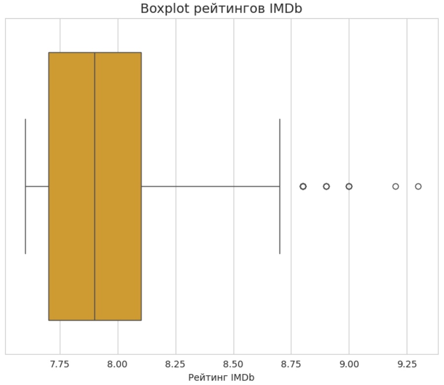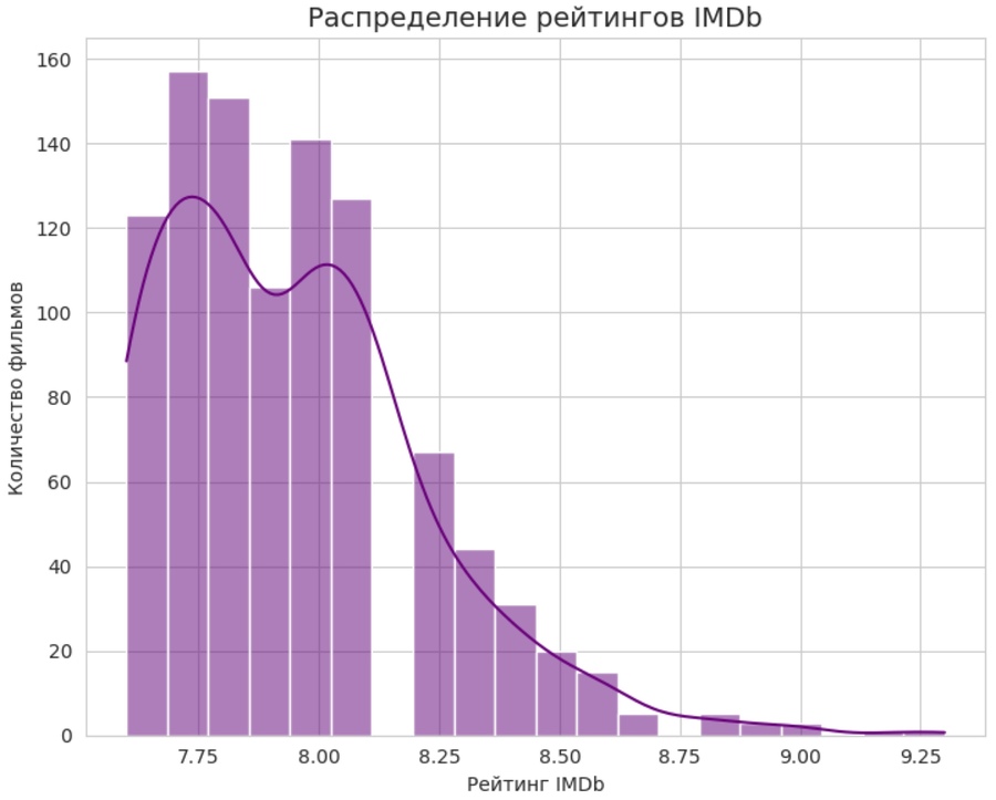 Распределение рейтингов IMDb: График показывает распределение рейтингов IMDb, то можно заметить, что большинство фильмов имеют рейтинг в диапазоне от 7.5 до 8.5. Это типично для IMDb, где фильмы с рейтингом выше 8.5 считаются исключительными, а ниже 7.5 — средними или ниже среднего. Фильмы с рейтингом выше 9.0 (например, «The Shawshank Redemption» с рейтингом 9.3) являются редкими и считаются классикой.