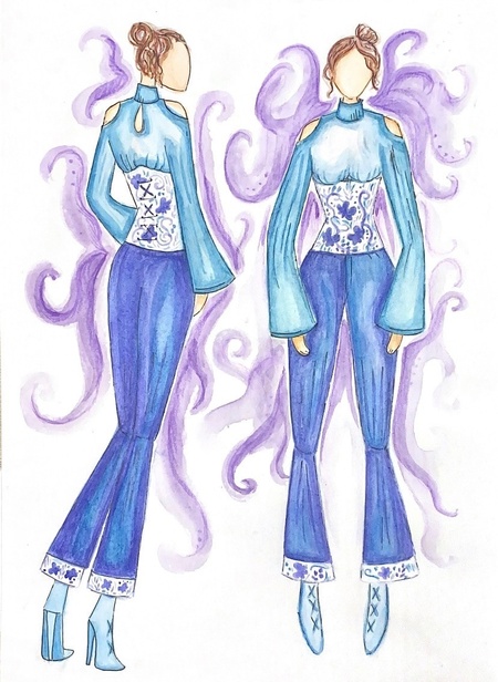 Блузка предположительно может быть изготовлена из тонкой хлопчатобумажной ткани, брюки — из плотной хлопчатобумажной ткани, а корсет — из плотного натурального шёлка с элементами росписи «гжельские узоры». На эскизе брюки изображены в синем цвете, а блузка — в голубом. Костюм разработан в фольклорном стиле.