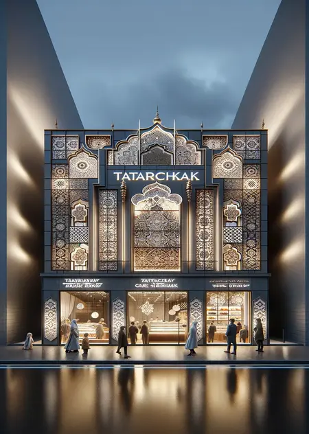 prompt: a striking exterior for «Tatarchak» bakery, marrying modern architecture with Tatar cultural motifs with a sleek facade adorned with intricate Tatar patterns