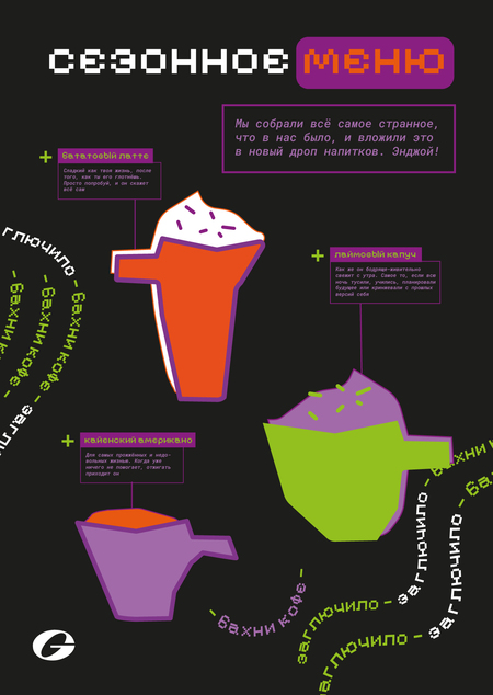 Моя глобальная идея заключается в том, что сейчас кофе — это конструктор. Есть всякие сезонные спешлы, миллион видов сиропов, куча разных помолов, обжарок и сортов зёрен. Вдохновляясь таким индивидуальным подходом к клиенту, я построила три варианта айдентики для кофейни Glitch