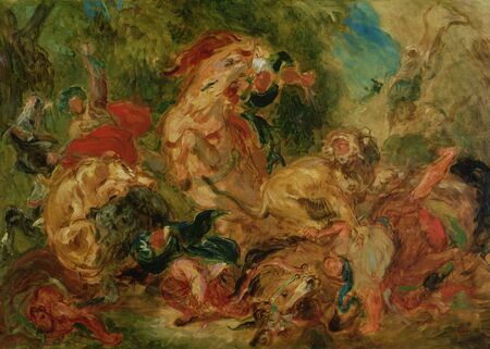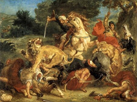 Герои сражаются с окружающей средой, которая хочет уничтожить их. Подобный лейтмотив борьбы за жизнь прослеживается на протяжении всей живописи Эжена Делакруа. Поездка в Северную Африку также поспособствовала развитию этой темы, а также повлияла на колористику его картин. Выбор цвета стал более сложным, контрастным и напряжённым.