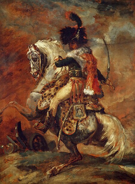 «„Офицер конных егерей императорской гвардии, идущий в атаку“ (1812, Париж, Лувр) — уже в самом названии выражено динамическое напряжение, которое пронизывает картину.» — Вера Раздольская