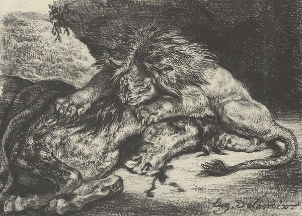 «Лев Атласских гор» — Эжен Делакруа (1829 год) // «Дикая лошадь, убитая тигром» — Эжен Делакруа (1828 год)