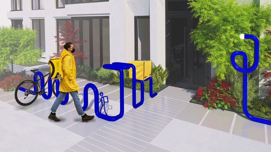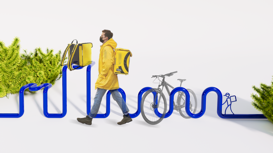 The composition for couriers consists of two modules — a backpack shelf of different heights and a bicycle parking. The composition can be angular and has to be placed at the entrance for the convenience of couriers.