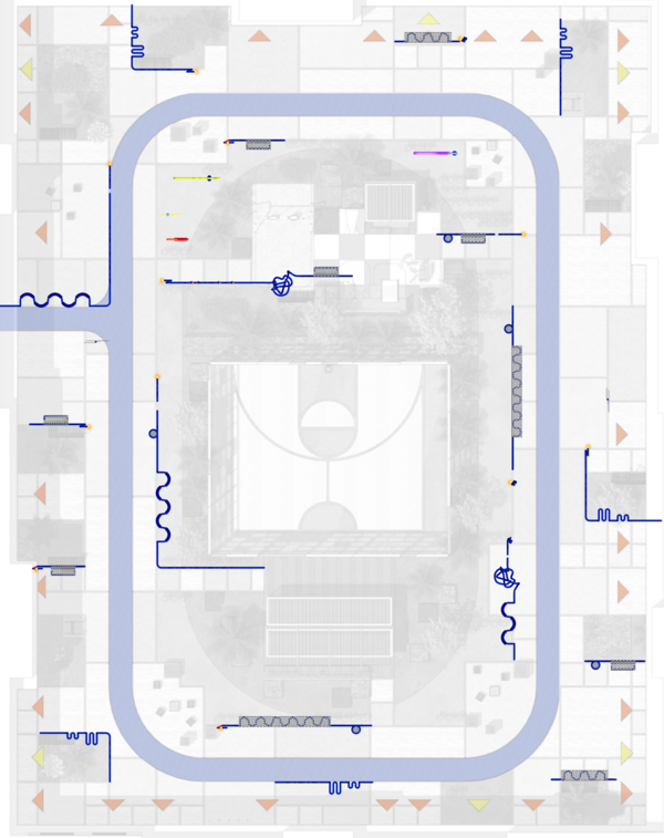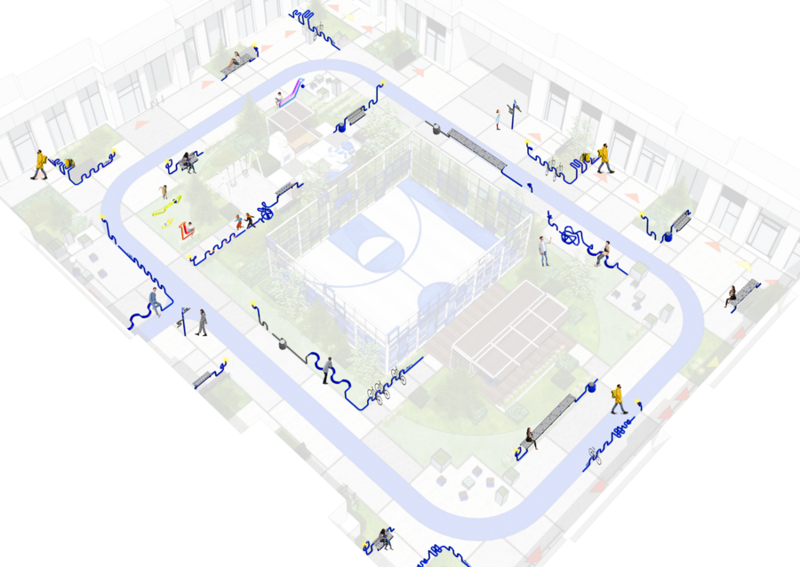 THREAD is inspired by the winding Chermyanka River near the CHESS residental complex, the tangle and sports markings because the idea of the residental complex is a space for playing.