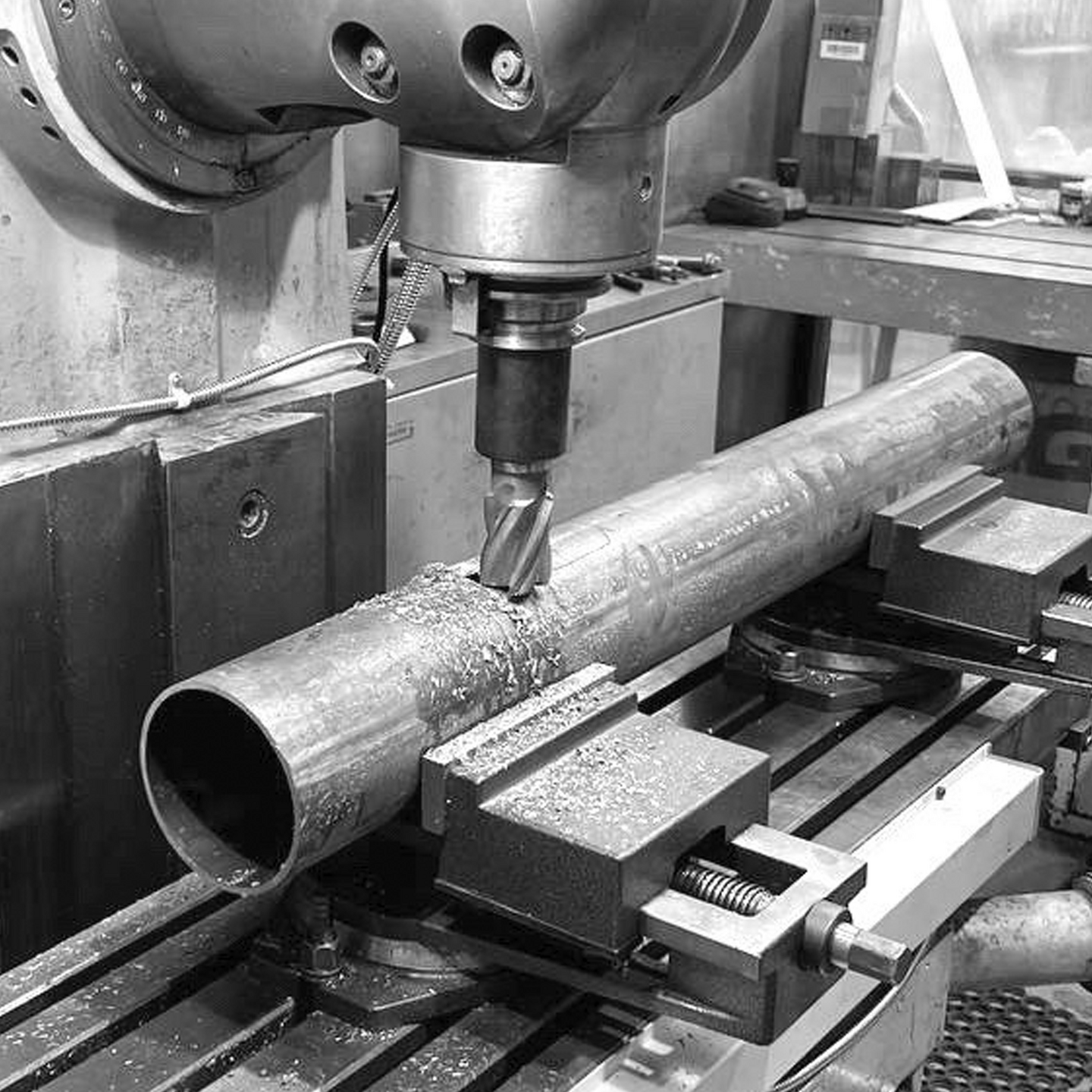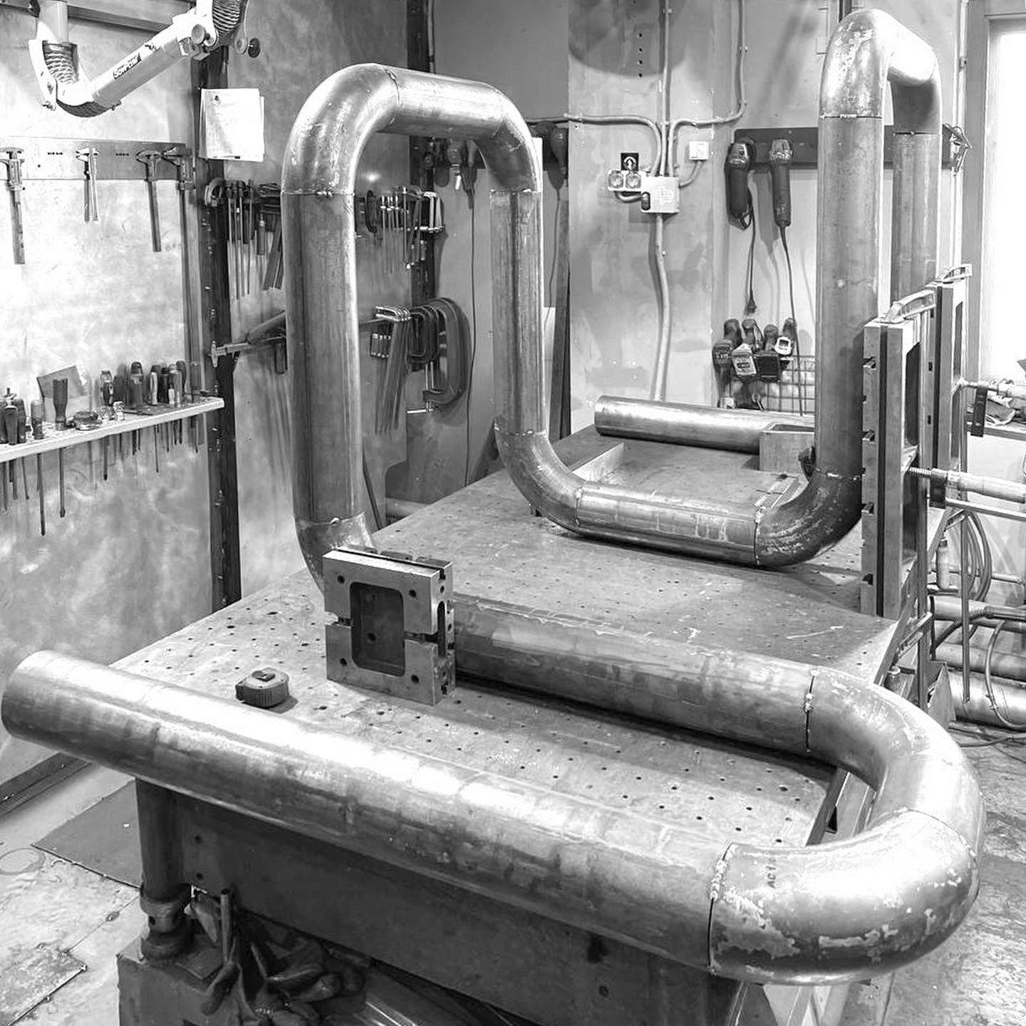 The main material of the collection — hot rolled steel pipe D110mm with powder coating RAL 5002.