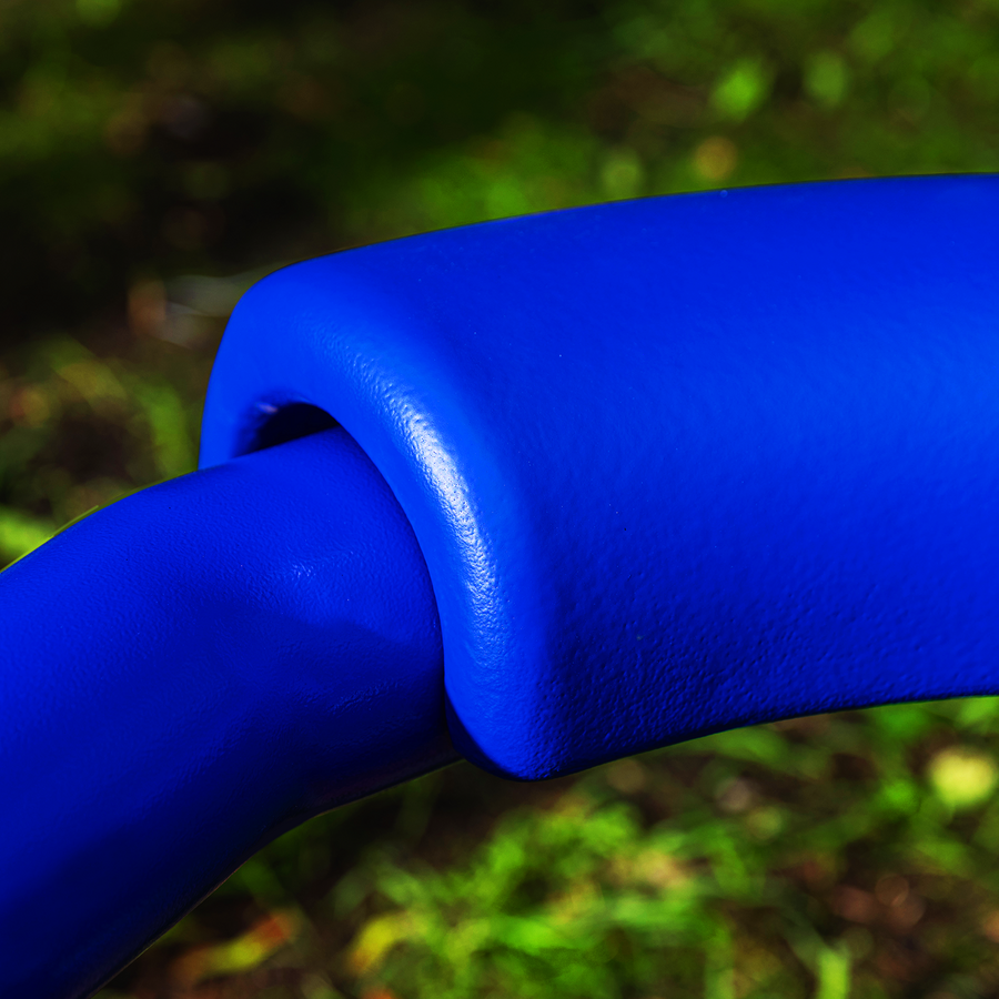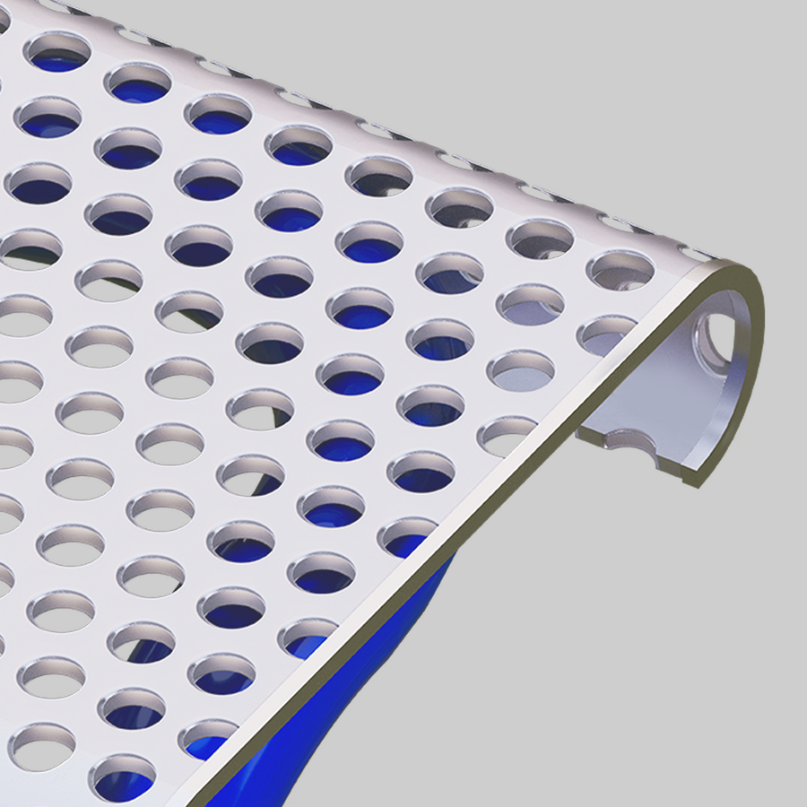 The soft seat material — Sixinch FLEXPLUS coating on soft polyurethane foam; the material of bench seats — perforated stainless steel sheet.