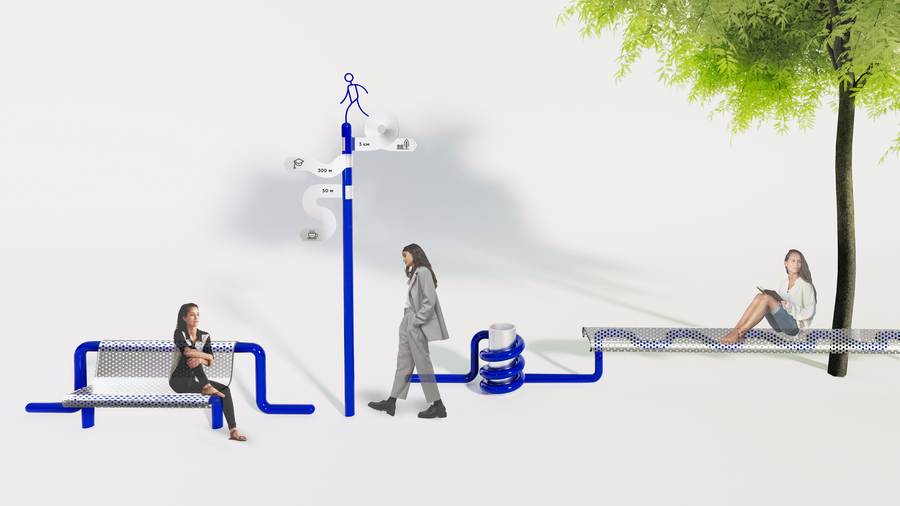 Modules for temporary standing and sitting and classic outdoor furniture — benches, navigation pole and litter bin module.