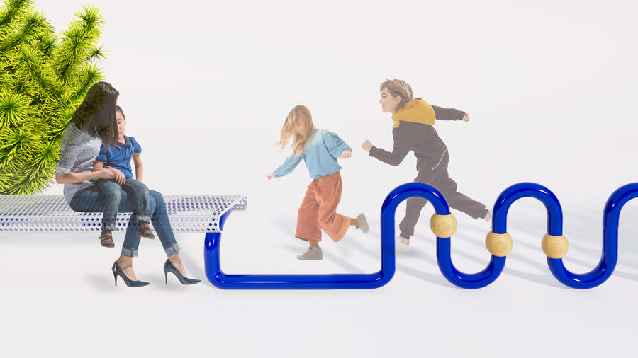 Interactive modules for playgrounds: a wave with balls that spin on their axis and up and down, and freestanding animal modules on which you can climb, play with a ball or move the balls.
