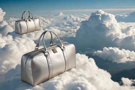 bags flying in the air and rising higher above the clouds, the bags moving away from the camera