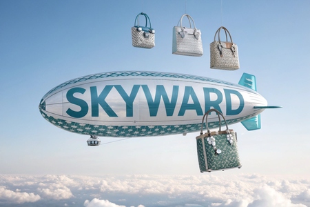 Signage on an airship with attached bags (accessories) with metallic glitter in the sky with a minimalist identity for an anti-gravity accessories brand with the words «Skyward» using a minimalist Futura Small Caps Book logo and font and a color palette in shades of blue, blue, white