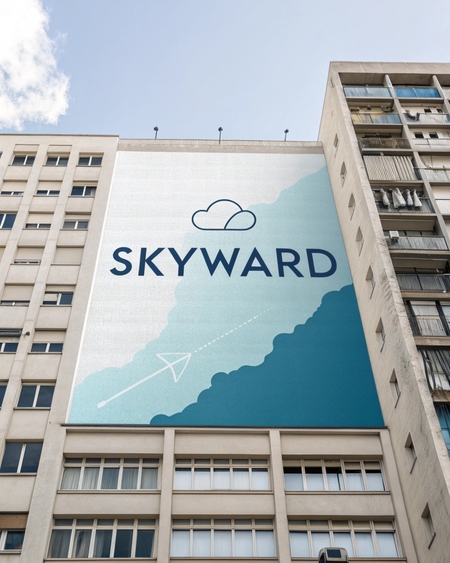 2. Huge poster on a multi-story building with minimalist brand identity of anti-gravity accessories brand saying «Skyward» using minimalist cloud logo and Futura Small Caps Book font and color palette in shades of blue, blue, white
