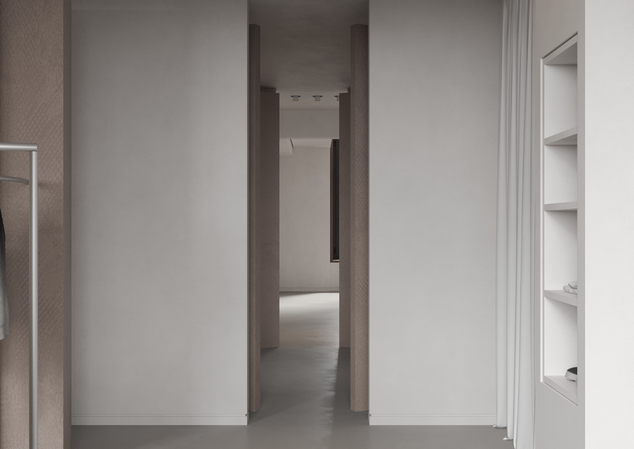 Стены коридора, ведущего во второй выставочный зал были скруглены, отсылая к плавным линиям логотипа бренда.