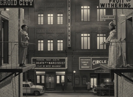 «Город астероидов» (2023) выделяется метаструктурой, где основное действие представлено как театральная постановка. Визуальное решение разделено на два плана: стилизация под телевизионную драму 1950-х годов в сценах «пьесы» и монохромные документальные кадры «за кулисами». Эта двойственность подчеркивается использованием разных кинематографических форматов, создающих диалог между реальностью и художественной условностью.