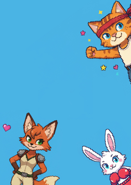 Промпт для Кика: The character is a pixel arcade-style white rabbit with a big head, huge, round, bright blue and pink eyelids, two soft pink blush circles on the cheeks — adds to the charm. He also has small pink nose. Long, upright ears with pink inner linings — classic bunny silhouette. One ear has a small pink bow tied near the base. He’s wearing only long red shorts with a pink heart pattern and big bright red boxing gloves on his arms. They contrast sharply with the white fur and cute accessories and suggest action, bravery, or even a sporty personality.