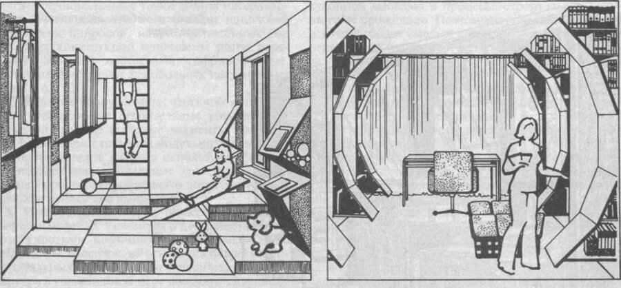 С первого взгляда видно, чего добивались авторы — существенного изменения взгляда на современное интерьерное оборудование (в частности мебель). Они хотели создавать полноценные механизмы, а не отдельные предметы или гарнитуры. Внедряя целую систему обустройства в пространство типичных квартир с прямоугольными комнатами, деконструируя их изнутри.