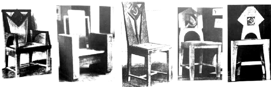 Проекты агитационной мебели начали появляться еще в 1920-х годах. И начнем с разработки стульев в рамках «агитационного стиля». Подобная мебель, по большей части, была рассчитана на крестьянские дома, поэтому не отличалась той нетрадиционностью, какой можно отметить мебель для рабочих клубов. Но к народной мебели отнести подобные вещи сложно, слишком много в них от элитарного.