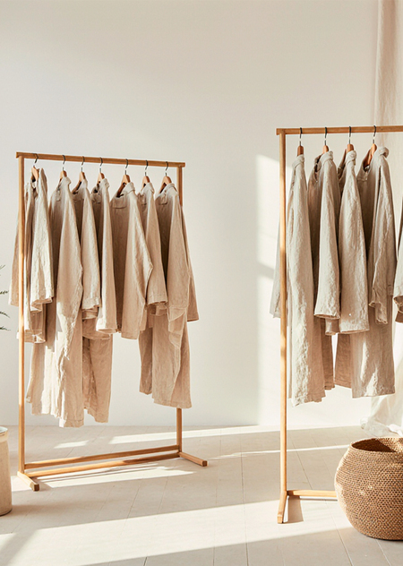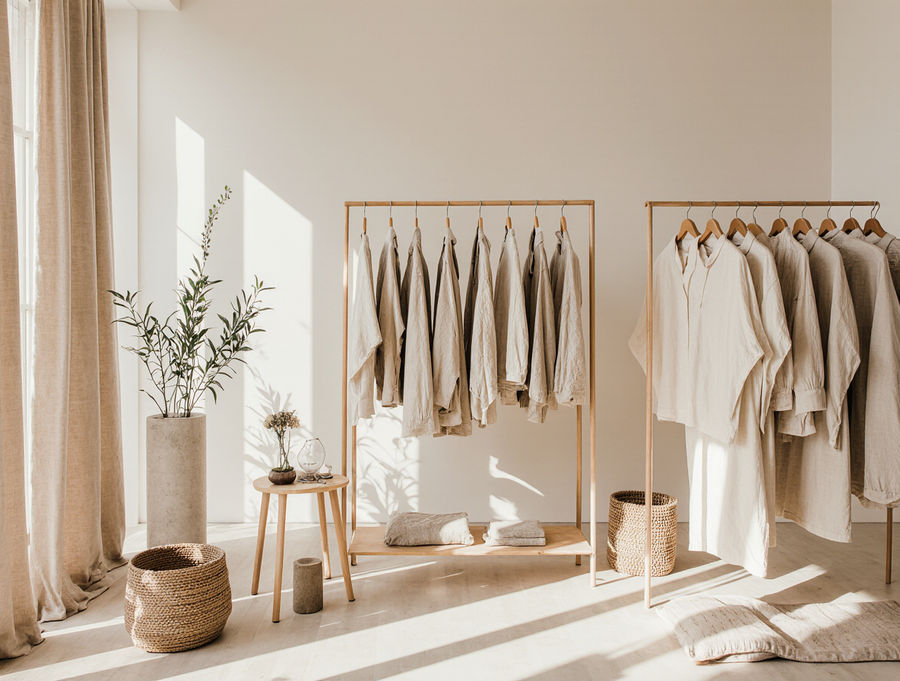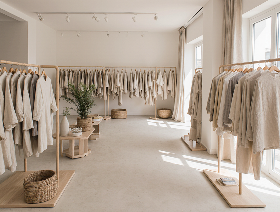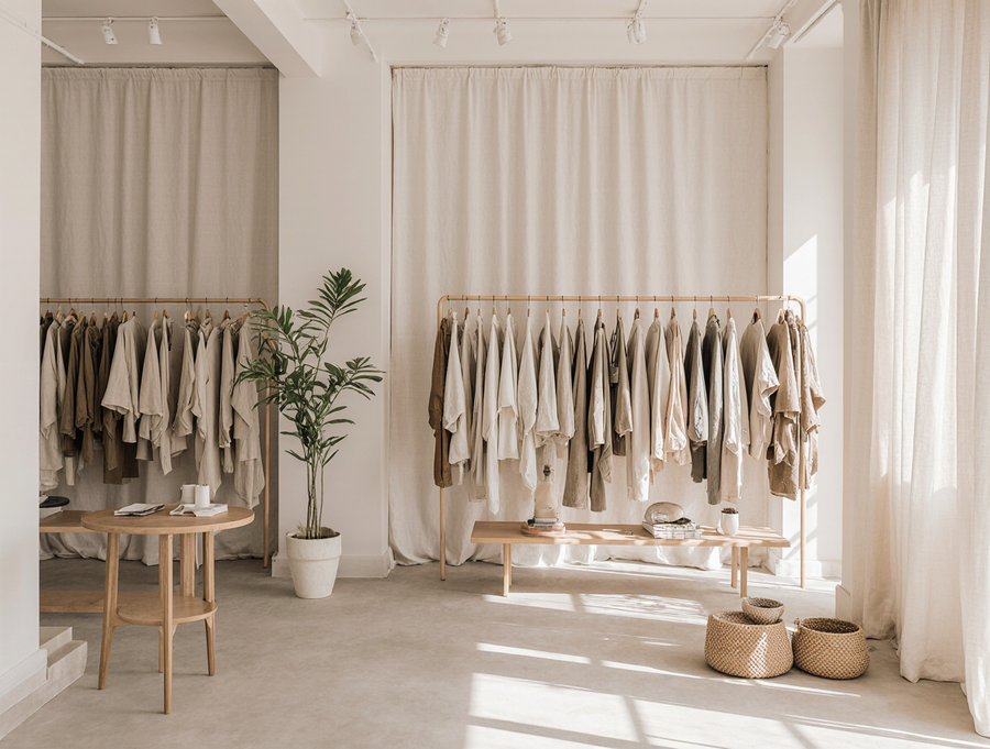 A serene, minimalist boutique interior for the women’s linen clothing brand «Woven Calm.» The space feels airy, natural, and sophisticated, reflecting sustainability and modern simplicity. Soft neutral tones — beige, sand, cream, warm white — dominate the palette. Natural materials such as light wood, linen, stone, and clay are used throughout. Elegant clothing racks display flowing linen garments in earthy hues. The layout is open and balanced, with soft, diffused lighting and subtle shadows. A few organic details — potted olive trees, ceramic vases, woven baskets, and linen curtains — add warmth. The overall atmosphere conveys calmness, elegance, and timeless craftsmanship.