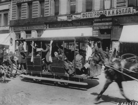 Трамваи, конки и первые автомобили фиксируют ритм города. Фотографии с движением показывают современность: транспортная динамика становится важным элементом городской сцены. Камера фиксирует взаимодействие человека и техники, городскую «механизацию» и социальные изменения, сопровождающие индустриализацию.