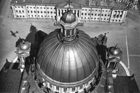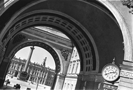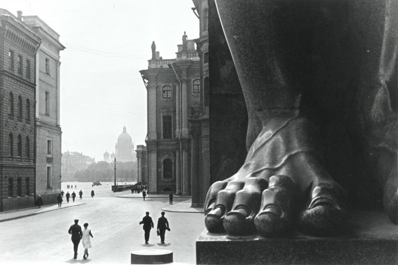 Панорамные виды Петербурга с высоты (балконы, крыши, колонады) служат не просто эстетическим приёмом, но визуальным заявлением власти. Фотограф, размещаясь выше, наблюдает город, фиксирует его оси и перспективы. Такой ракурс создаёт ощущение визуального контроля и господства над пространством — город предстает как упорядоченная геометрическая структура, отражение имперской мощи.