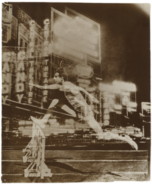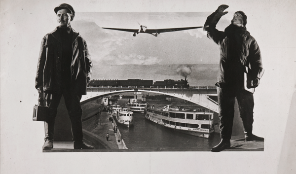 Густав Клуцис не снимает город — он создаёт его заново через монтаж. Фотомонтаж становится «архитектурой идеологии»: линии, фрагменты зданий, динамические фигуры соединяются в новые структуры. Город предстает как пространство будущего, собранное из элементов настоящего.