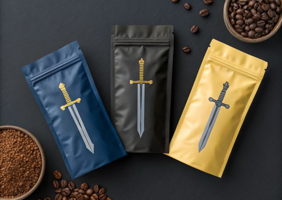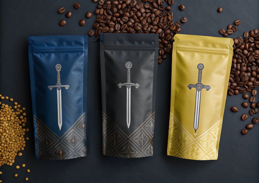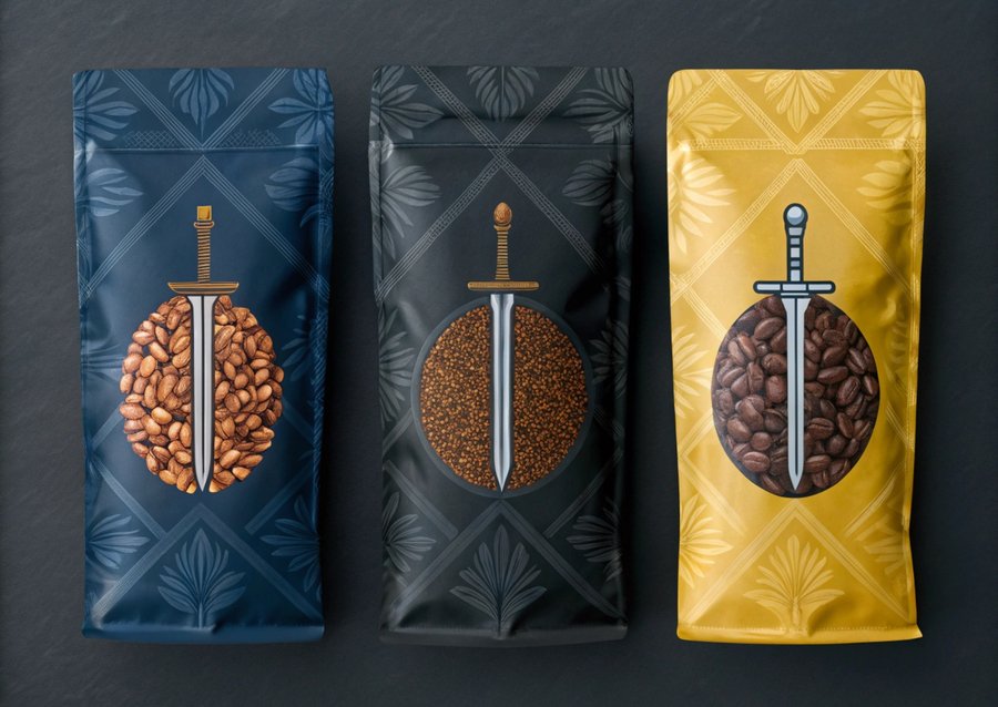 Промпт: Photo of three packs of coffee. Dark background. The illustrations on the packages depict different coffee beans and swords. There is a grain in the center of the package, and swords. Image is a style of engraving. Dark Blue, Dark Gray, Yellow colors. Realistic photo