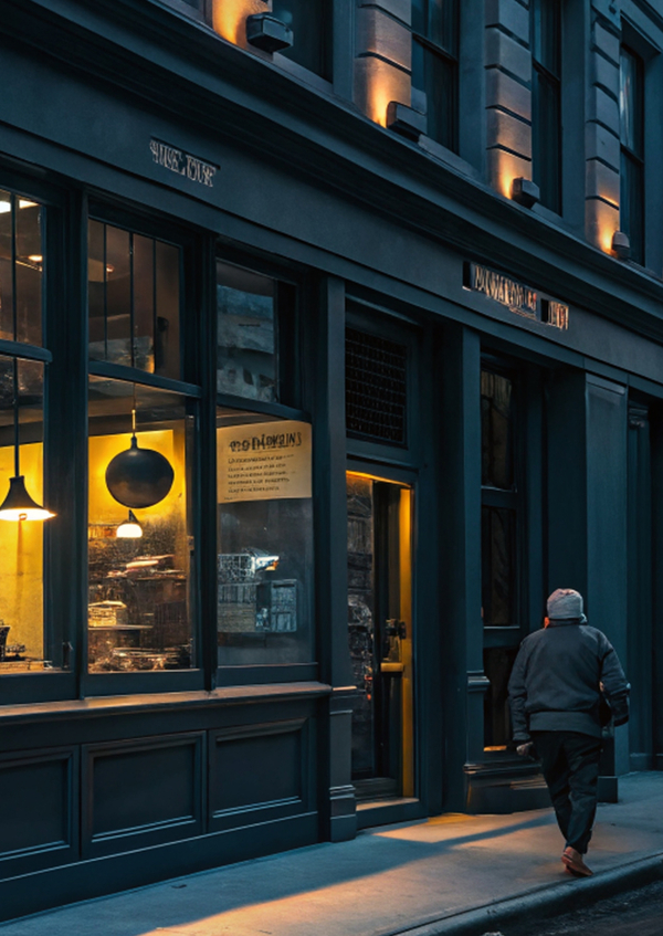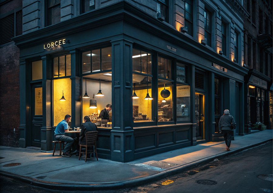 Промпт: urban coffee shop. Dark colors, blue, gray, yellow. Warm, subdued light. The atmosphere of comfort and silence. Interior/Exterior. Photorealism