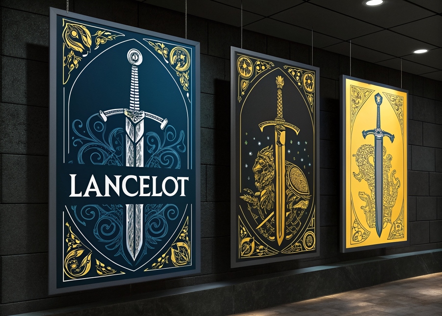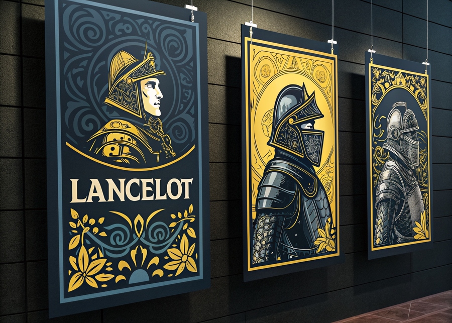 Промпт: illustration of three posters for advertising. Dark background. Dark colors, blue, black, yellow. An image of the knight’s armor parts. The inscription on poster is «Lancelot». Decorative style of engraving