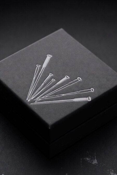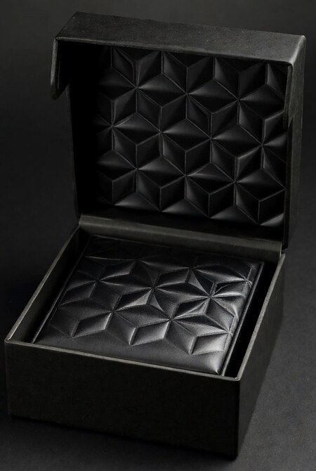 Black and white luxury packaging for jewelry, minimalist black box with embossed geometric pin patterns, high contrast monochrome, architectural unboxing experience, stark product photography --no color --no ribbons --no decorative elements