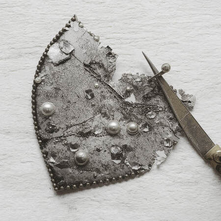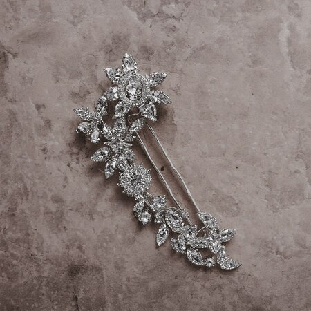 Промт: Product photography of jewelry repair using metal pins, broken vintage brooch transformed with minimalist pin interventions, using color palette: