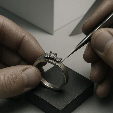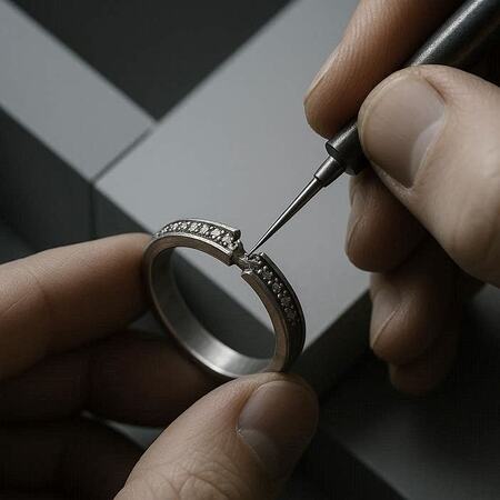 Промт: Close-up of hands performing jewelry repair with steel pins, transforming damaged piece, using colors
