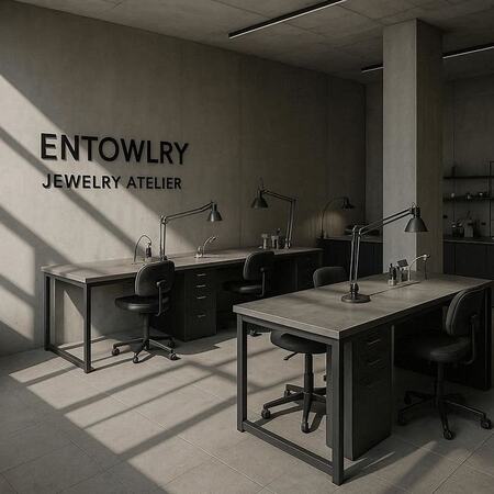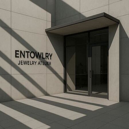 Промт: Interior/exterior of ENTOWLRY jewelry atelier, minimalist architectural space combining laboratory and workshop, using color palette